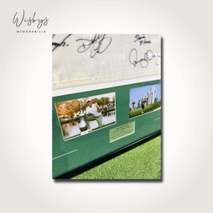 Bringing together the revered signatures of Rory McIlroy, Padraig Harrington, Damien McGrane, Graeme McDowell, Darren Clarke, Paul McGinley, and Peter Lawrie, this exceptional framed pin flag becomes a treasure trove of golfing greatness. Each autograph stands resiliently against the fabric, a testament to legends who have left indelible marks on the sport. Encased with a Certificate of Authenticity, ensuring its storied provenance, this flag is an impeccable embellishment for any serious collection. It’s more than an artefact; it’s a tangible legacy of one of golf’s most resilient traditions.