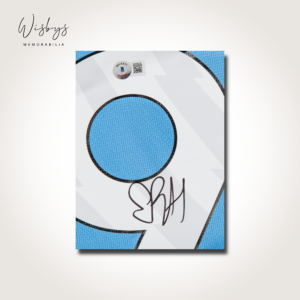 Professionally framed for display, this piece is built to be a centrepiece in any collection. The jersey features Haaland’s signature prominently displayed on the number 9, alongside the Manchester City crest and sponsor branding against the classic sky-blue colourway. It also comes with a Beckett Witnessed Certificate of Authenticity, meaning the autograph was witnessed at the point of signing for an added layer of provenance and collector confidence.