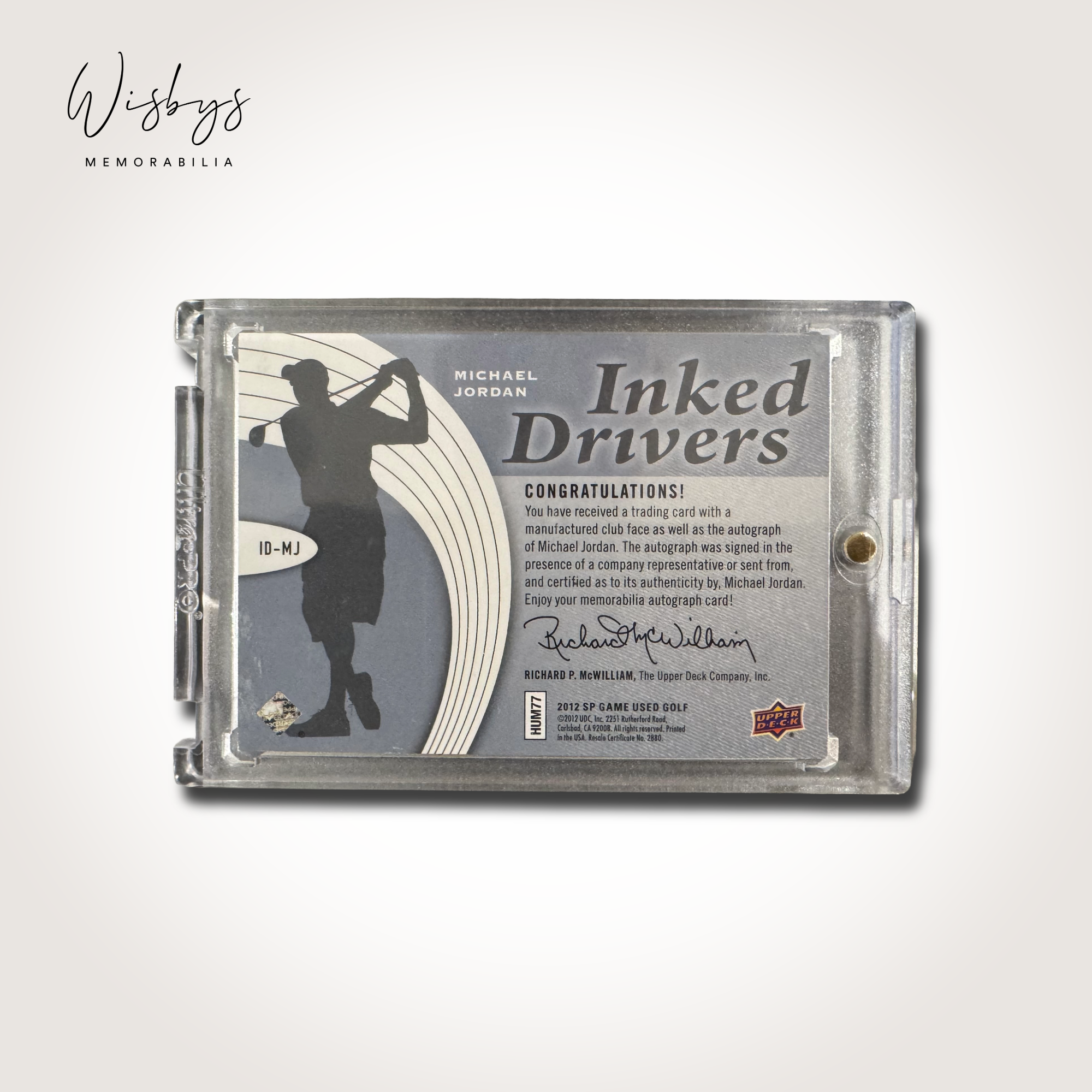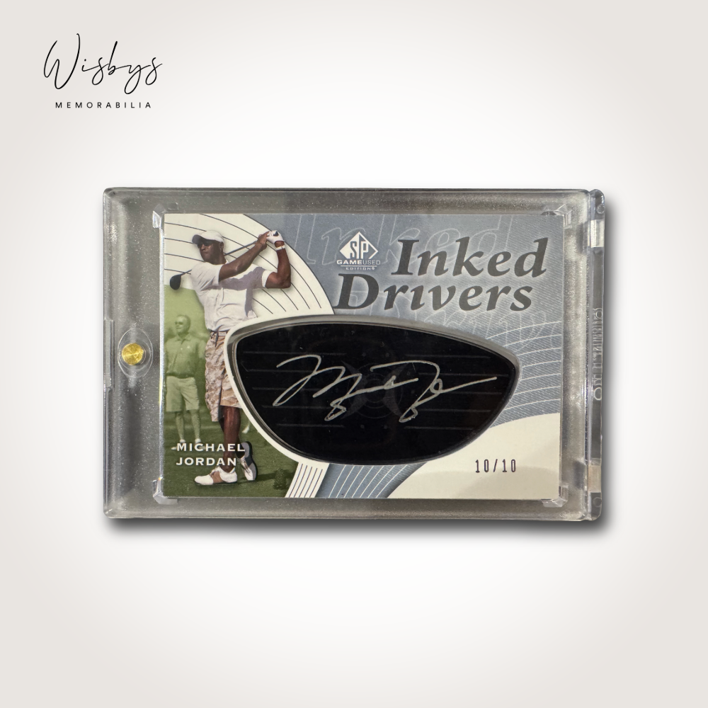 A truly rare and unique collectible, this 2012 SP Game Used Inked Drivers card features an authentic embedded driver face signed by the greatest of all time—Michael Jordan. Combining Jordan’s legendary legacy with his love for golf, this piece bridges two sporting worlds in a creative and highly limited format.
